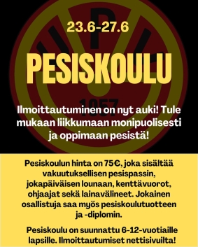 UPV järjestää tulevana kesänä jälleen tutun pesiskoulun. Pesiskouluhan on liikunnallista toimintaa, jossa pesiskipinän saaneet 6-12-vuotiaat tytöt ja pojat aloittavat oman pesisharrastuksensa. Pesiskoulun ideana on
