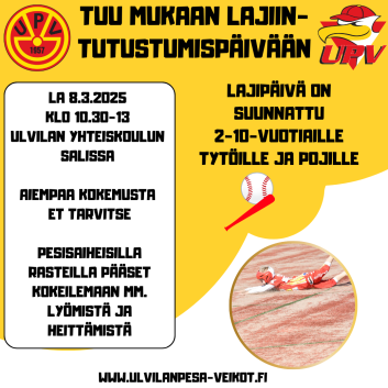 Tuu mukaan lajiintutustumispäivään! UPV järjestää lajiintutustumispäivän la 8.3.2025 klo 10.30-13 Ulvilan yhteiskoulun salissa (Kaarinantie 4, Ulvila) Lajipäivä on ensisijaisesti