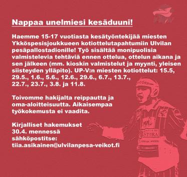 Nuorten työelämään pääsy on meille tärkeää. Siksi tänäkin kesänä palkkaamme Länsi-Suomen Osuuspankin tuella yhden 15-17-vuotiaan nuoren kesätöihin. Haemme kesätyöntekijää miesten