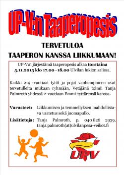 Tervetuloa taaperon kanssa liikkumaan! Huomenna, torstaina 5.11.2015 klo 17.00-18.00 Ulvilan lukion salissa aloittaa UP-V:n Taaperopesis, joka liikuttaa 2-4 -vuotiaita tyttöjä