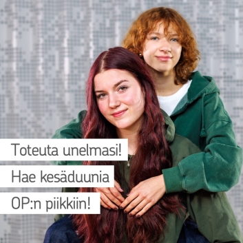 OP Länsi-Suomi tarjoaa nuorille mahdollisuuden toteuttaa unelmia ja tutustua työelämään. Lahjoitamme toimialueemme valituille yhdistyksille kesätyöpalkkasi kahdeksi viikoksi. Tarjolla on 75 kesätyötä.