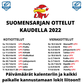Nyt on hieno tilaisuus ostaa kausikortti Suomensarjan peleihin. Kampanjassa Pipo-/Kaulahuivipaketti. Pipo-/Kaulahuivikampanja voimassa 15.4.2022 Osta kausikortin lisäksi UPV:n pipo ja/tai huivi, niin tarkenet