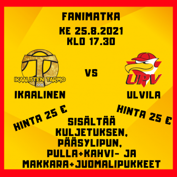 UPV järjestää fanimatkan edustuksen vierasotteluun 25.8. Ikaalinen-UPV. Lähtö on Ulvilan Automaatio Areenalta klo 15.30 ja fanimatkan hinta on 25 €,