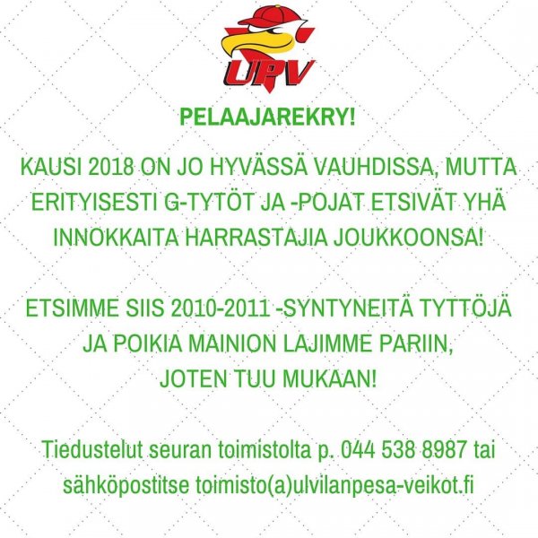 Pelikauden alku lähenee ja lumet toivottavasti sulavat ennen sitä. Joukkueilla on jo hyvä vauhti päällä, mutta erityisesti G-ikäiset joukkueemme kaipaisivat muutaman lisäpelurin. Jos tunnet siis innokkaita 2010- ja 2011-syntyneitä tyttöjä ja poikia, niin ilmoitappa heille, että tilaa olisi ja mainio pesiskesä luvassa.