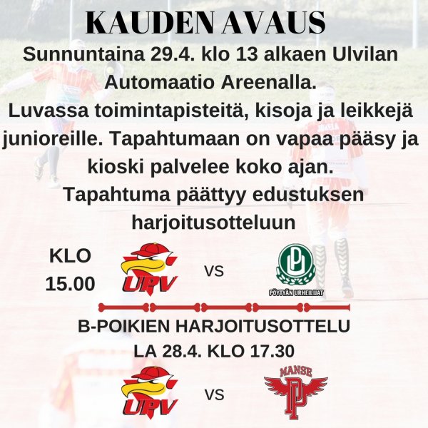 Kauden avaustilaisuus pidetään sunnuntaina 29.4. klo 13 alkaen. Luvasssa on toimintapisteitä, kisoja ja leikkejä junioreille. Tapahtumaan on vapaa pääsy ja kioski palvelee koko ajan. Tapahtuma päättyy edustuksen harjoitusotteluun Pöytyän Urheilijoita vastaan.