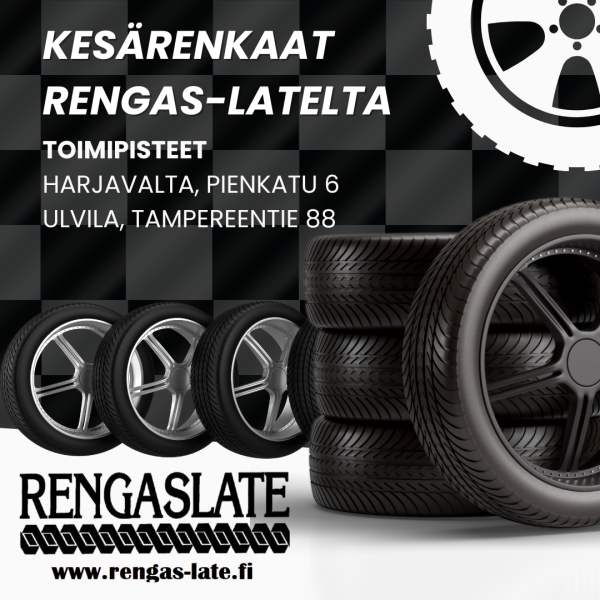 Kohta on aika vaihtaa talvirenkaat kesärenkaisiin. Jos tarvitset uudet kesärenkaat, niin voit ne hankkia yhteistyökumppaniltamme Rengas-Latelta, jolla on toimipaikat Harjavallassa ja Ulvilassa.
