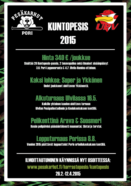 Pesiskesä lähestyy yhtä nopeasti kuin lumet sulavat Satakunnassa. Kevät tekee siis tuloaan ja odotettu kuntopesis pääsee kohta vauhtiin. Kuntopesis alkaakin kaikkien joukkueiden yhteisturnauksella Ulvilan pesäpallostadionin ja koulukeskuksen kentillä lauantaina 16.5.2015. Kuntopesiskesä huipentuu Porin urheilukeskuksessa järjestettävään lopputurnaukseen lauantaina 8.8.2015.