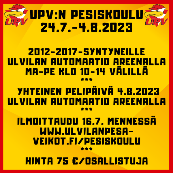 UPV järjestää tulevana kesänä jälleen tutun pesiskoulun. Pesiskouluhan on liikunnallista toimintaa, jossa pesiskipinän saaneet 2012-2017-syntyneet tytöt ja pojat aloittavat oman pesisharrastuksensa. Pesiskoulun ideana on toimia kesäisenä harrastepaikkana lähellä lasta ja liikuttaa monipuolisella liikunnalla leikinomaisesti. Pesiskoulu tarjoaa kaikille lapsille mahdollisuuden pelaamiseen ja onnistumisen elämyksiin. Ohjaajina toimivat miesten edustusjoukkueen pelaajat Luka Karhu ja Luka Tuominen