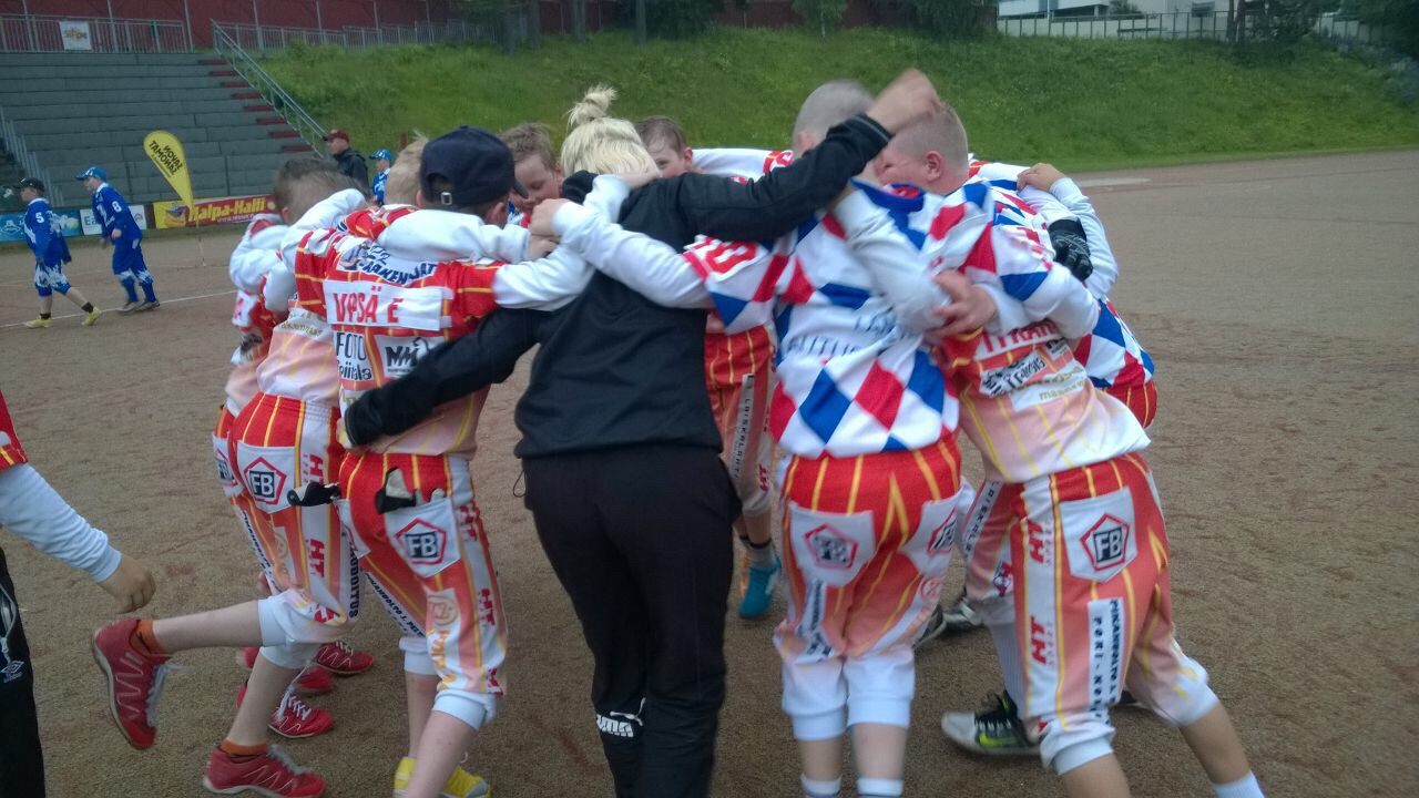Vasemmalla voitontanssi, oikealla yhteiskuva voitetun Itä-Länsi -ottelun jälkeen (Kuvat: Elli-Noora Salminen ja Tenavaleiri)