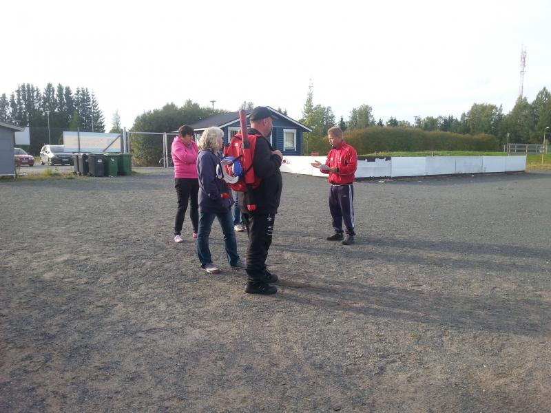 Osa vanhemmista jäi seuraamaan, kun lapsille opetettiin sekä heitto- että lyöntitekniikkaa. Aluksi pelattiin kuitenkin leikkimielistä peliä, ettei homma mennnyt heti kovin vakavaksi. Lapset olivat riemulla mukana ja sai Mikolakin vähän hikeä pintaan. Lapset näkivät myös Kiviojan hienon taidonnäytteen pesälle syöksymisestä.